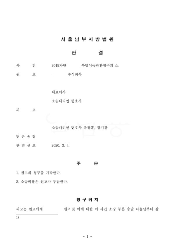 제1심: 의뢰인을 대리하여 전부승소하였습니다.