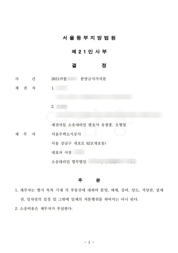 민사 - SH공사 분양금지가처분 신청 성공사례 (실제 판결문 첨부)
