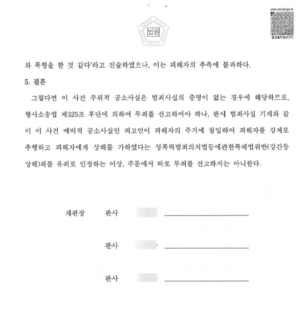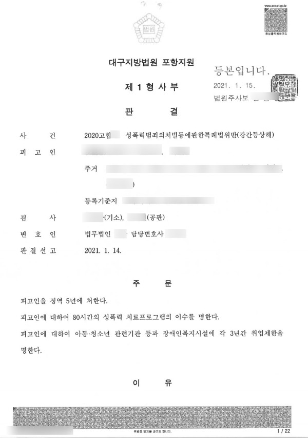 유광훈 변호사, 장기환 변호사는 법원에 피해자대리인 의견서를 제출하였고, 피해자가 법정에 출석하여 증인신문 받는데 도움을 드렸습니다. 1심 재판부는 공소사실을 모두 인정하고 강간등상해(강제추행으로 상해를 입힘)로 불구속 되었던 피고인에게 징역 5년(실형)을 선고하고 법정구속하였습니다.