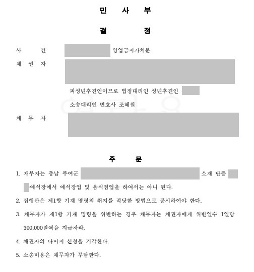모두 인용하는 결정을 하였습니다. 이에 따라 상대방은 무단으로 영업을 계속할 경우 1일당 300,000원씩을 의뢰인에게 지급하여야 할