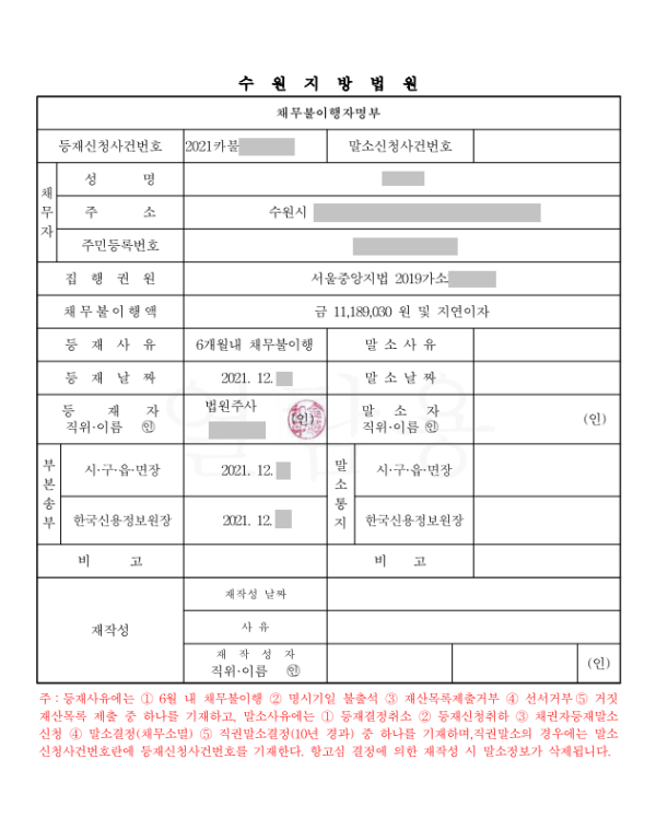 이로서 채무자는 법원에 채무불이행자로 등재되었고, 은행연합회, 저축은행중앙회 및 채무자 주소지 시장 (구청장, 읍장, 면장) 에 송부되며,