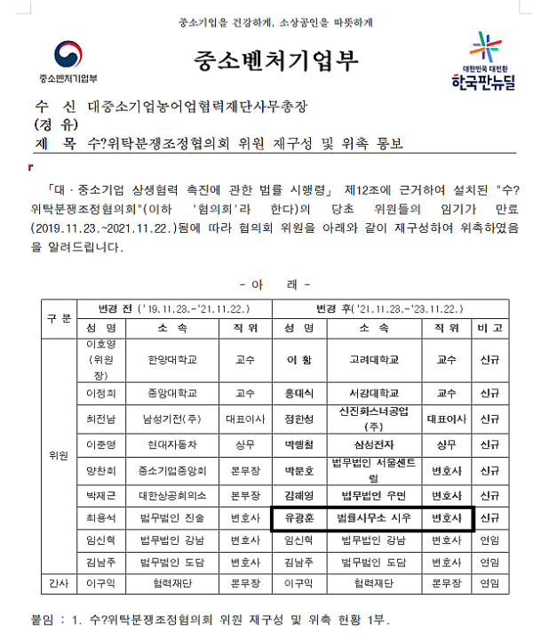 유광훈 변호사가 중소벤처기업부 수위탁분쟁조정협의회 위원으로 위촉되었습니다.