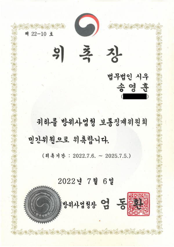 송영훈 변호사 방위사업청 보통징계위원회 민간위원으로 위촉 페이지 정보 법무법인시우 작성일22-07-11 본문 법무법인 시우 송영훈 변호사가 2022. 7. 6. 방위사업청 보통징계위원회 민간위원으로 위촉되었습니다. 목록 답변