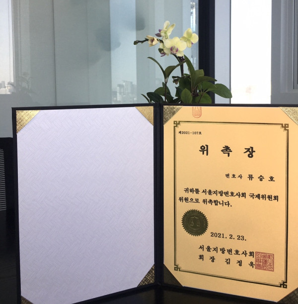 법무법인 시우 류승호변호사가 서울지방변호사회 국제위원회 위원으로 위촉되었습니다