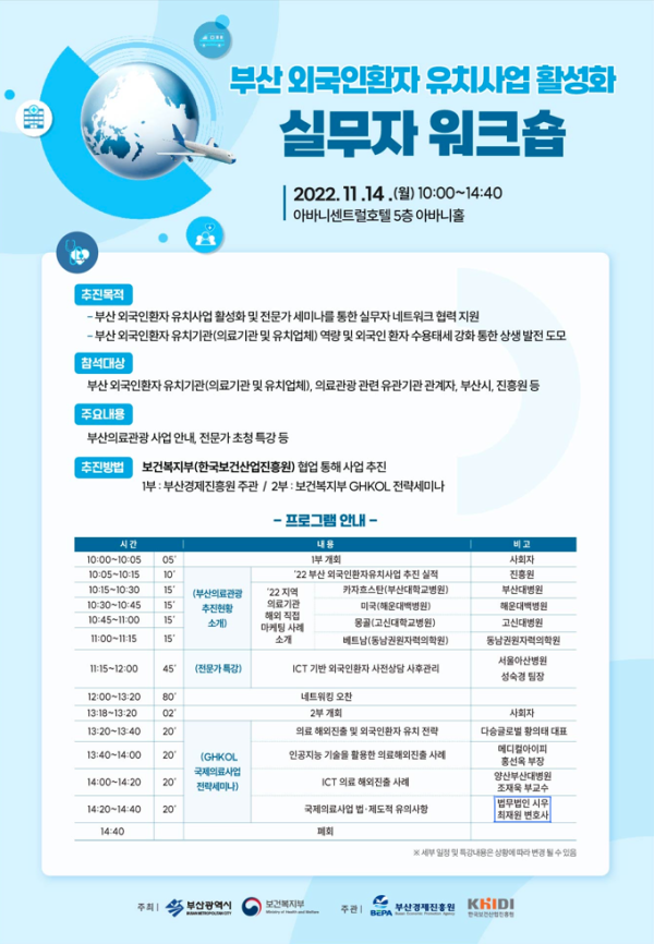 법무법인시우 부산분사무소 최재원 변호사는 2022.11.14.자 보건복지부가 주최하고 한국보건사업진흥원이 주관하는 부산 외국인환자 유치사업 활성화 실무자 워크숍에서 '국제의료사업법·제도적 유의사항'에 관해 강의를 하게 되었습니다.